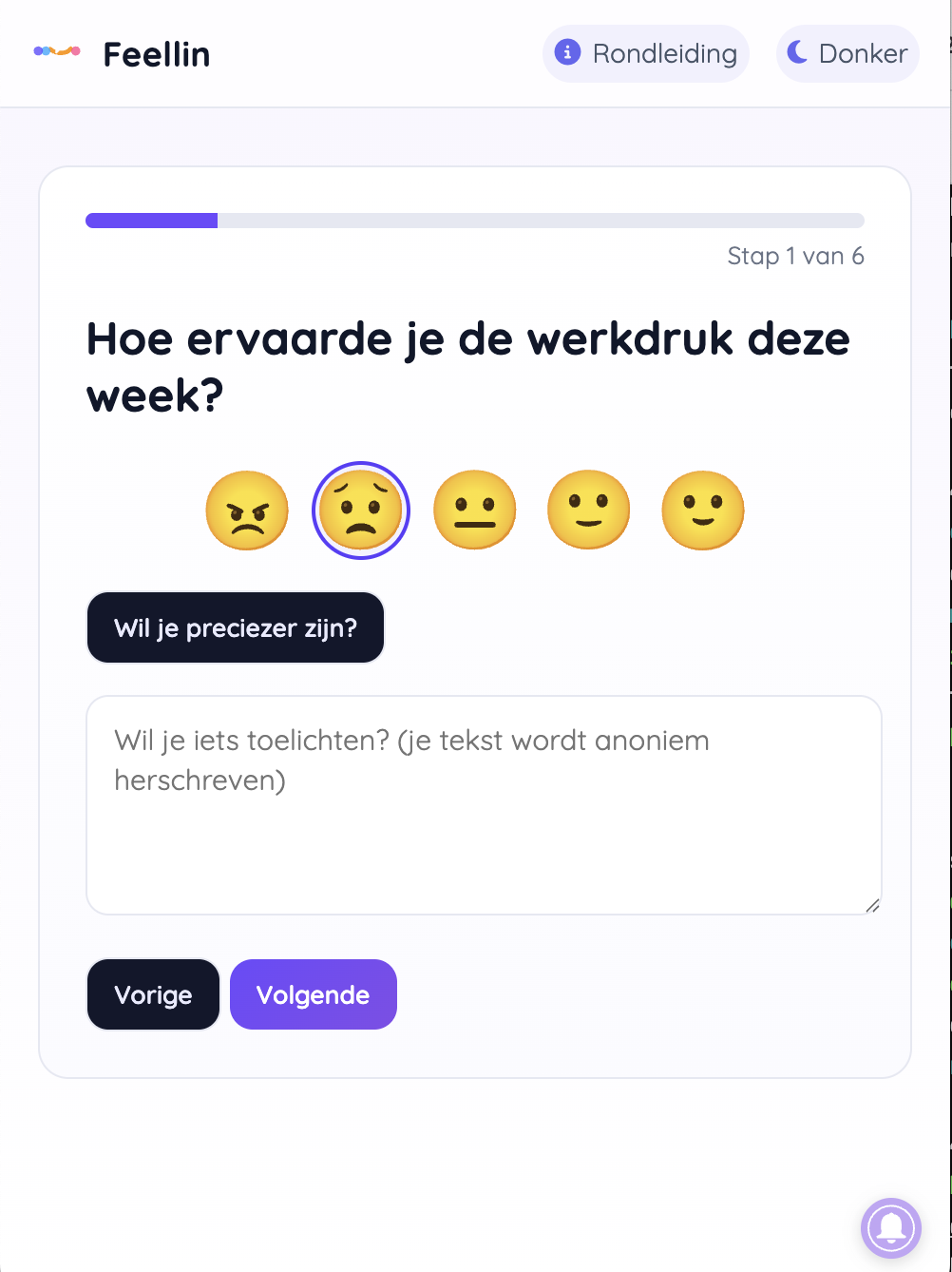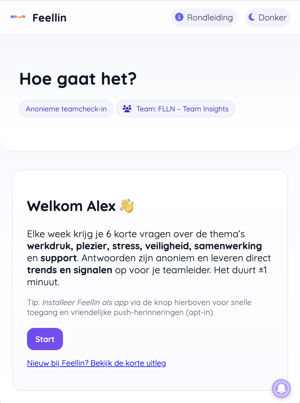 Met Feellin deelt je team anoniem hoe het gaat. De check-ins zijn kort, de inzichten direct zichtbaar in je dashboard.